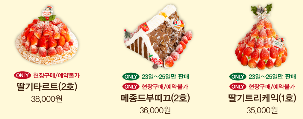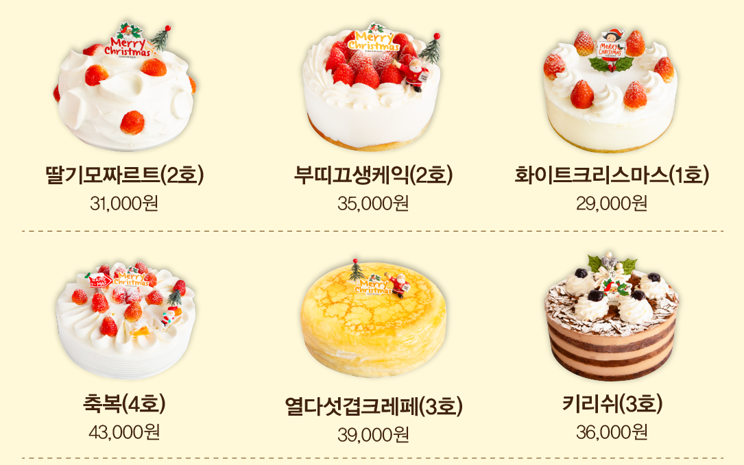 딸기모짜르트(2호), 부띠끄 생케이크(2호), 화이트크리스마스(1호), 축복(4호), 열다섯 겹크레페(3호), 키리쉬(3호)입니다.