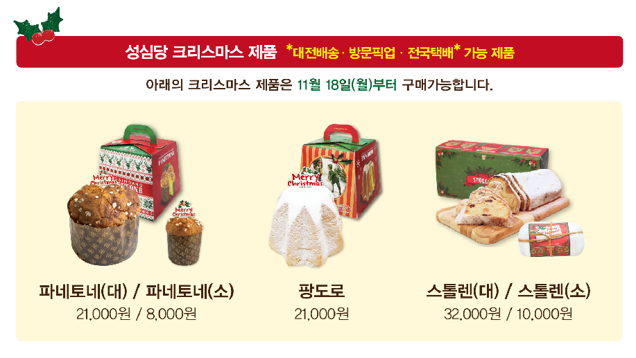 성심당 크리스마스 케이크 예약은 2024년에는 12월 2일부터 시작됩니다. 예약 일정은 성심당 공식 홈페이지 또는 소셜 미디어 채널을 통해 공지됩니다.중요한 포인트가 있습니다. 현재 성심당 홈페이지는 개편 중입니다. 때문에 성심당 크리스마스 케이크 사전예약은 전화예약만 가능합니다!